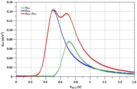 The simulated fundamental transconductances (gm), represented as, “gm1s”, “gm1p” and “gm1s + gm1p” of transistors Ms, Mp, the second-order transconductance (gm’) mentioned as “gm2s”, “gm2p” and “gm2s + gm2p” of transistosr Ms, Mp, and the third-order transconductance (gm”) noted as, “gm3s”, “gm3p” and “gm3s + gm3p” of transistors Ms, Mp with respect to biasing voltage, Vb, are shown in Figure 12, Figure 13 and Figure 14, respectively.