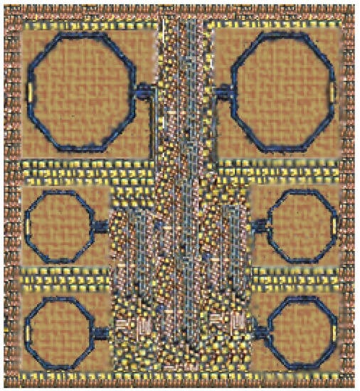 The proposed mixer, which comprises the TCC-CS, I-DS technique, is fabricated in 65 nm CMOS technology. The mixer chip microphotograph is shown in Figure 15. The mixer’s chip size is 0.4 mm (0.71 × 0.57 mm), with the exclusion of chip pads. Chip layout is carried out to ensure the stable permanence of the mixer and to reduce the parasitic resistive, capacitive and inductive effects of interconnecting lines and the parasitic capacitive effects of multiple diffusion strips. The size of transistors is divided into multiple fingers to decrease the series resistance and parasitic capacitances of the gate of transistors. Furthermore, due to multiple finger transistors, the nonlinearity due to shunt capacitance decreases and high gain is achieved. The proposed mixer’s ground layer is designed with a multi-layer technique by using different metal layers to develop a low inductive and resistive ground path. Thick and large power lines are designed to achieve the good analog current (AC) coupling between the ground and also to prevent a voltage drop. The metal insulator metal (MIM) with a capacitance of 2.2 fF/m is used to design a capacitor. Meanwhile, inductors of the mixer with a quality factor (Q) equal to 12 are designed by using metal layer 5 of 65 nm CMOS technology with 12 m thickness. To mitigate the electromagnetic interference (EMI) in between the inductors, a 16 m ground plane shield from the inductor coil is implemented.