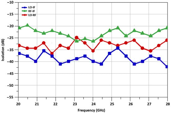 The isolation between LO-port to RF-port, RF-port to IF-port, and LO-port to IF-port of the mixer at 24 GHz is −35.1 dB, −27.3 dB, −40 dB, respectively, and it is shown in Figure 17.