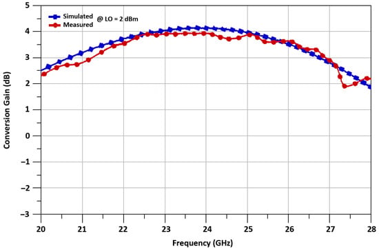 The proposed mixer’s conversion gain is simulated and measured for 24 GHz up-converted RF frequency, with the 21.6 GHz LO frequency, and 2.4 GHz IF frequency. The conversion gain increases with the increment of the LO power, but for low power operation, LO is selected to be 2 dBm. The maximum measured conversion gain at 24 GHz RF frequency is 4.1 dB. The conversion gain of a mixer is equal to 3.2 ± 0.9 dB, versus frequency from 20 to 30 GHz is illustrated in Figure 18, while conversion gain versus LO power from −8 dBm to 8 dBm is shown in Figure 19.