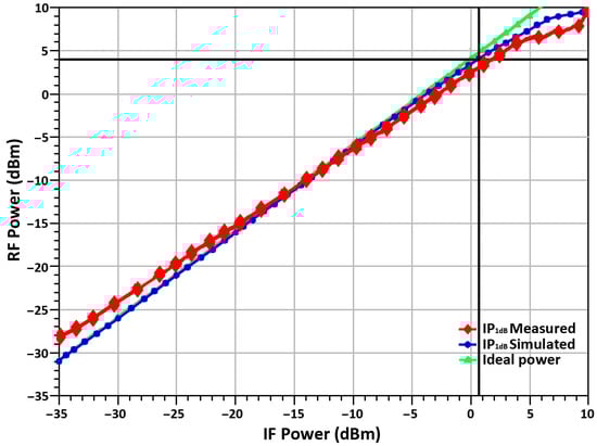 The linearity result of the proposed up-conversion mixer is illustrated in Figure 20, which shows input power versus output power curves. The mixer shows a measured OP1dB of 4.1 dBm, and the IP1dB is 0.67 dBm, respectively, demonstrating good linear performance.