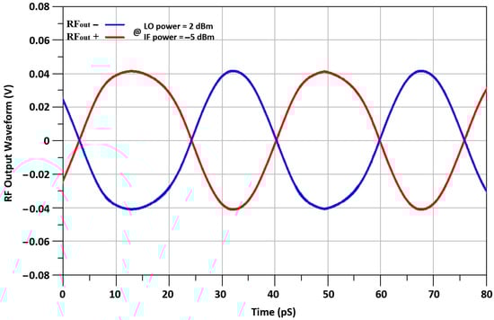 The noise figure (NF) performance of the mixer is indicated in Figure 21. The NF of 3.8 dB at RF frequency of 24 GHz is achieved. The NF is comparatively high because of the insertion of extra transistors of I-DS transistors. The up-converted RFout+ and RFout- transient wave-forms of the designed mixer are shown in Figure 22, where up-converted RF output signal is 24 GHz. The peak–peak voltage swing of RF signal of the mixer is equal to 80 mV.