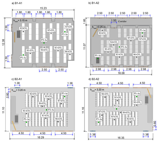 - The average VR value provided by the selected configuration for each classroom was 8.3 ACH, 6.1 ACH, 8.4 ACH and 8.8 ACH for classrooms B1-A1, B1-A2, B2-A1 and B2-A2, respectively. Therefore, the average ACH value is above 6 ACH in all the selected natural ventilation configurations.