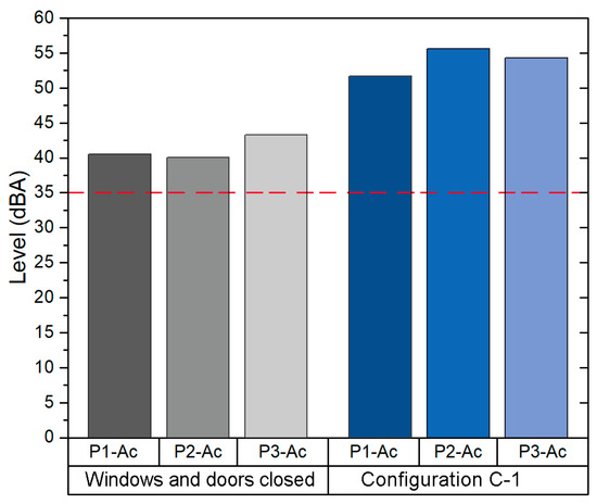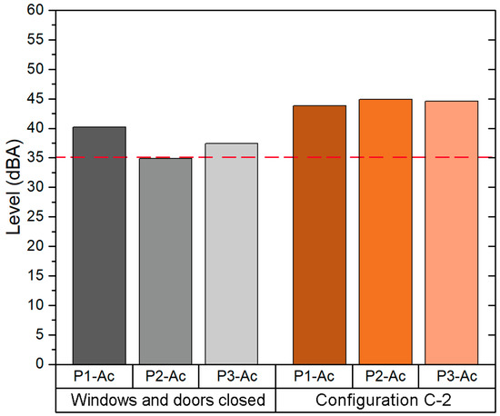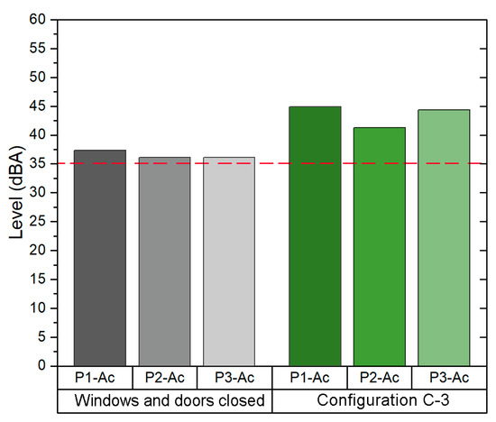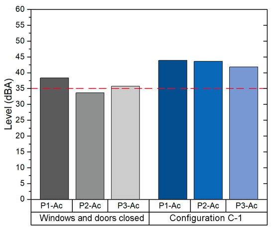 - The background noise level is strongly affected by the selected natural ventilation configuration. The background noise levels with the selected natural ventilation configuration were between 43.2 and 54.1 dBA. As can be seen, all classrooms exceed the recommended 35 dBA background noise level limit for background noise in teaching spaces. Consequently, the teaching activity management has to take into account not only the ACH, but also its impact on the indoor environmental conditions such as the acoustic environment. Since a high value of background noise level can interfere with the teaching and learning process and even interfere with the performance of students and teachers, educational building administrators need to consider this issue. In those cases where in order to achieve a natural ventilation strategy that provides the required VR, the background noise level exceeds 35 dbA, building managers should make intervening adaptations (i.e., installation of passive, active, automation-based or hybrid noise control devices).
