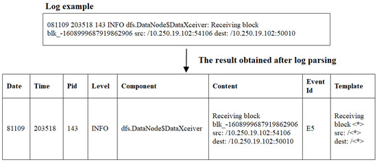 - He, P.; Zhu, J.; Zheng, Z.; Lyu, M.R. Drain: An Online Log Parsing Approach with Fixed Depth Tree. In Proceedings of the IEEE International Conference on Web Services, Honolulu, HI, USA, 25–30 June 2017; pp. 33–40. [Google Scholar]