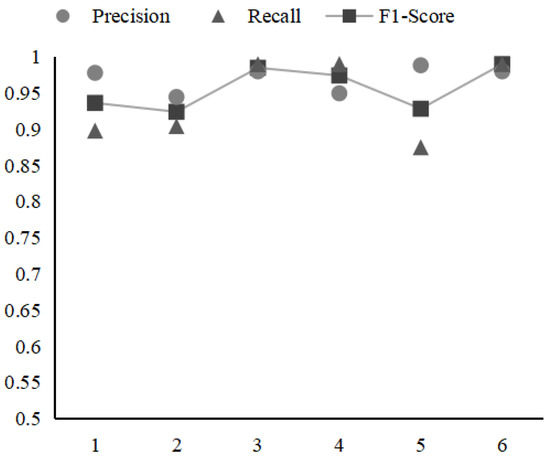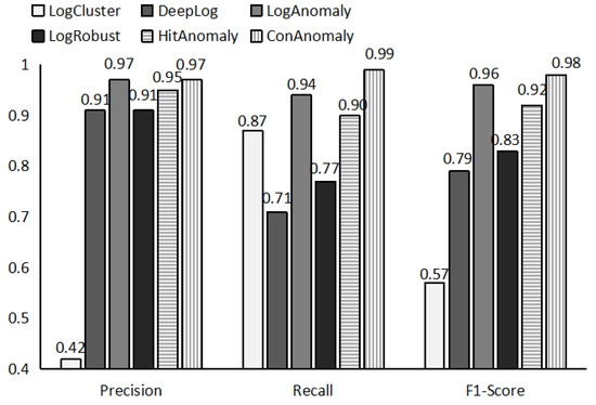 Figure 5 shows the performance of ConAnomaly compared to five baseline methods over the BGL dataset. ConAnomaly achieves the highest recall among the six methods, having an F1 score of 0.98. LogAnomaly and ConAnomaly can detect anomalies with a more than 95% F1-score, which demonstrates that the semantic information of the log is helpful for log anomaly detection. LogAnomaly generates more false alarms than ConAnomaly because it does not address the problem that the new log does not match the old log template and that the log data is not balanced. LogCluster does not achieve good detection accuracy on BGL data. The poor performance of LogCluster is caused by the high dimensional sparsity of the event count matrix. As a result, log clustering makes it difficult to distinguish between anomalies and normal conditions, which often results in a large number of false positives.