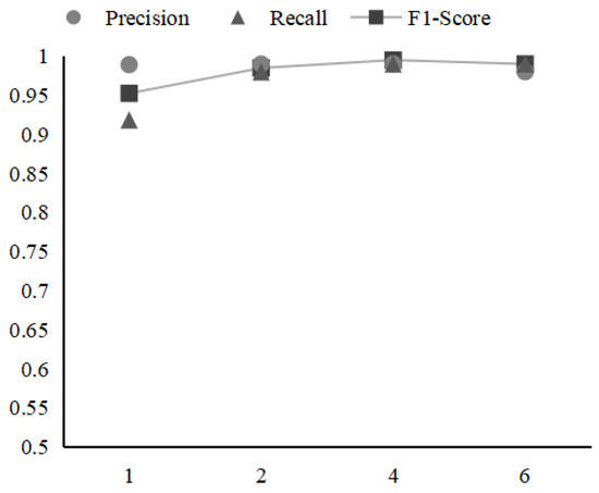 Figure 8 presents the performance impact of window size in ConAnomaly. Window size refers to the maximum distance between the current and predicted word within a log. As can be seen from the figure, in general, the precision of ConAnomaly is fairly stable with concerning different window sizes while it has an impact on the recall of the model. When the window size value is equal to 3, the model has the highest recall value. The smaller the window size, the worse the semantic relevance of the logs the system learns. The larger the size of the Widow, the easier it will be to overfit the model.