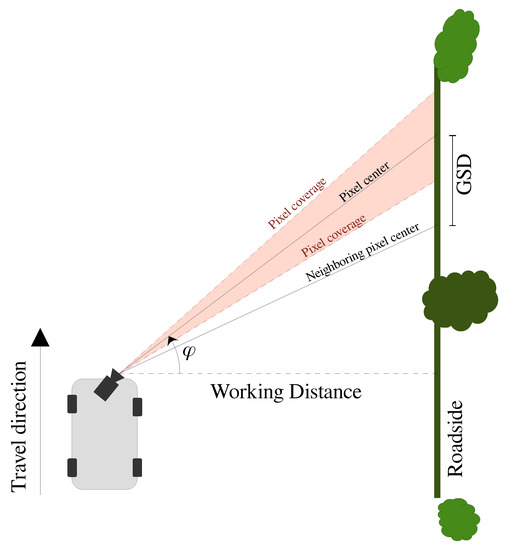 The spatial resolution is defined as the distance on the object that is covered by the distance between neighboring pixels as illustrated in Figure 1. In remote sensing this unit is called ground sampling distance (GSD), since the camera is often pointed towards the ground and the spatial resolution becomes the ground distance between two pixels ([20], p. 31). The unit is meter per pixel. There are three main factors that affect the ground sampling distance. The first is the image sensor’s resolution and size. The second is the focal length of the lens. The third is the distance from camera to the object (roadside) along the camera’s primary axis (illustrated as ‘Pixel center’ in Figure 1). When the camera points in the direction of travel, the least amount of blur is obtained in the image, but at the same time, part of the image will be useless, as it does not cover the roadside. When the camera is pointing in the direction of travel, we get pictures that cover the largest possible area. However, this is at the expense of the ground sampling distance and, thus, the level of detail.