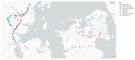 Images were collected along the Danish state roads near the Midwestern part of Jutland, Funen and Zealand during four days between late August and early October 2020 (Figure 5). During image collection, the following seven IAPS were recorded: (1) Cytisus scoparius, (2) Heracleum (Heracleum mantegazzianum, Heracleum sosnowskyi and Heracleum persicum), (3) Lupinus polyphyllus, (4) Pastinaca sativa, (5) Reynoutria (Reynoutria japonica and Reynoutria sachalinensis), (6) Rosa rugosa, and (7) Solidago (Solidago canadensis and Solidago gigantea).