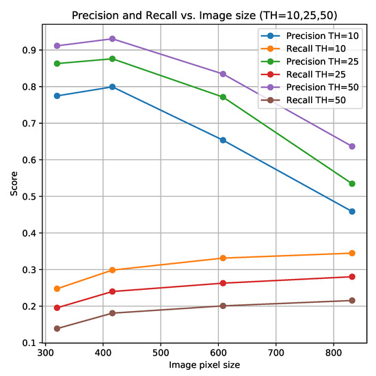 Figure 11 shows the impact of the scaled image size and confidence threshold (TH) on the precision and recall. The average precision (88% vs. 77%) is higher with a scaled image size of 416 × 416, compared to 608 × 608 pixels with a confidence threshold of 25%. The recall is only 2%-points lower (24% vs. 26%) with the scaled image size of 416 × 416.