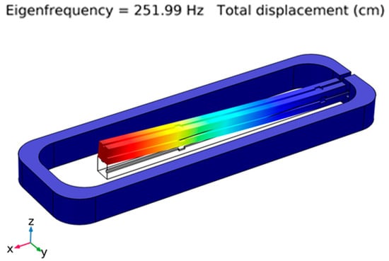 The mechanical properties of the printed structure were studied both analytically and experimentally. The analytical structural analysis was performed with COMSOL Multiphysics® (COMSOL Inc., Stockholm, Sweden) using the solid mechanics module. The natural frequency modes were determined using the model of the printed structure, attaining a first natural frequency of 252 Hz and the vibration mode shown in Figure 2.
