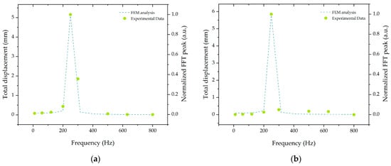 The frequency-dependent deflection of the structure was studied by applying a 10 N load at the cantilever free edge with a harmonic perturbation with frequencies between 10 and 800 Hz. The maximum displacement of the cantilever was calculated and compared with the experimental results for the z-direction, as presented in Figure 3a. The experimental data were attained by applying a sinusoidal acceleration with a constant 10 m/s2 amplitude and a frequency in the range of 10 and 800 Hz. The experimental data were in accordance with those calculated analytically where a maximum fast Fourier transform (FFT) peak value at 250 Hz was attained near the eigenfrequency value and as expected. The same procedure was followed for the y-direction, attaining similar results as presented in Figure 3b. The normalized FFT peaks were determined by calculating the fast Fourier transform of the temporal signal and analyzing the peak with a higher amplitude. The results were then normalized to the highest value.