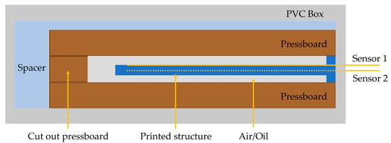To simulate the conditions of a dry and oil-filled power transformer, the structure was embedded in a cut-out pressboard spacer and then enclosed between two other spacers. The replica of the dry power transformer was placed inside a PVC box to contain the system, as presented in Figure 5. A spacer was added to perfectly fit the pressboard assembly to the box, preventing additional structural vibrations.