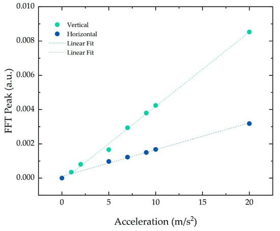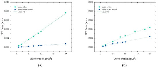 The inclusion of mineral oil in the simulated environment was also studied, as shown in Figure 7. The oil, which acted as a damper, contributed to a decrease in the FFT peak amplitude of 89% in the vertical direction and 46.5% in the horizontal direction. Nonetheless, the linear behavior of the FFT peak with the increase in acceleration was preserved under these conditions in both directions.
