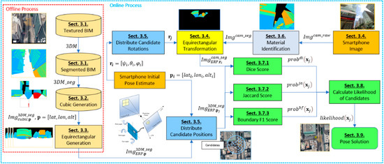 Based on the generated images, we propose a semantic VPS method for smartphone-based urban localization. In the online process, the user captures an image with their smartphone (Section 3.4), with the initial position estimated by the smartphone GNSS receiver and IMU sensors. Then, candidates (hypothesized positions) are spread across a search grid based on the initial position (Section 3.5). The smartphone image is then segmented based on the identified types of materials (Section 3.6). The segmented smartphone image is transformed into the equirectangular projection image (Section 3.4) to be matched with the candidate images using multiple metrics to calculate the similarity scores (Section 3.7). The scores of each method are combined to calculate the likelihood of each candidate (Section 3.8). The chosen position is determined by the candidate with the maximum likelihood among all the candidates (Section 3.9). The details of the proposed method are described in the following section.