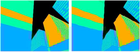 Because each object in the building model already contains a corresponding name, a color can be assigned for the material the name represents, which can then be used to efficiently simulate a segmented BIM, as shown in Figure 1, and allows fast scalability of a BIM map. In this research, we used six classes to test the feasibility of the proposed method. Each class has its own respective RGB color: Sky (black), Concrete (blue), Glass (green), Metal (orange), Foliage (yellow), Others (light blue).