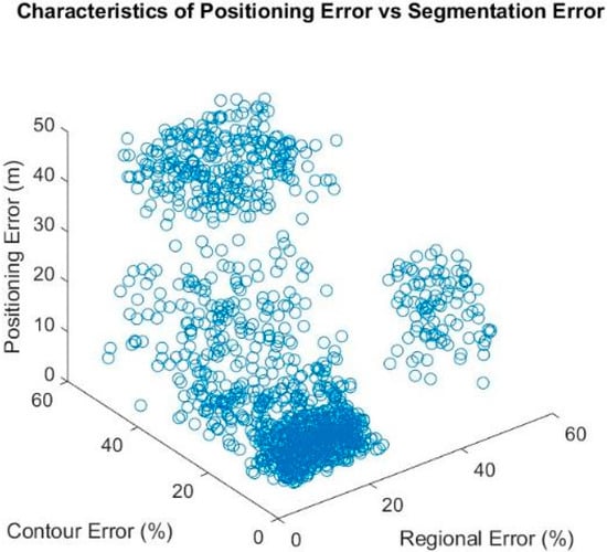 The results show a good positioning accuracy at lower levels of segmentation error. It can be seen the positioning error in the 0 to 20% segmentation error range is approximately 0–5 m. However, the proposed method begins to suffer when incorrect segmentation reaches more than 20% for contour-based errors and 25% for regional-based errors. This is followed by a deteriorating positioning performance, where the positioning error increases to 10–20 m. At 40% contour- and regional-based errors, the matching algorithm fails to perform accurately, increasing the risk of greater positioning error. It can be seen at this segmentation error range, the distorted image matches with random incorrect candidate images; thus, the positioning error spreads across a wide region.