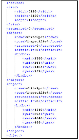 Every image in the dataset was labelled manually by creating a corresponding XML file (Figure 2) for each image containing the X and Y coordinates of every defect in that image alongside the type of that defect. A team of professionals in detecting the end users’ wafer defect types participated in defining and selecting the defects in the sample images. The coordination of these defects was performed manually using software called ‘LabelImg’.
