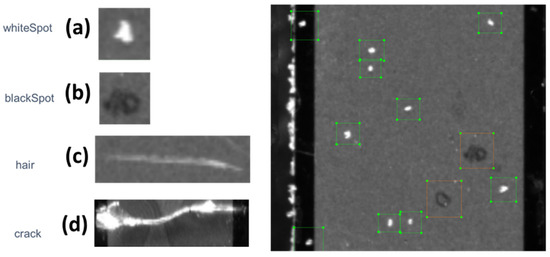 Different defects in plenoptic images. (a,b) represent small white and black spots, respectively, as a result of the accumulation of dust and dirt. (c), as the label suggests, is human hair, whereas (d) shows physical cracks on the surface of the specimen due to tension. The right side of the figure represents (a,b) labelled defects in green and orange rectangles, respectively.