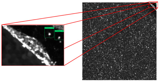 Additionally, a measurement was taken to test and validate the accuracy of the model in terms of the minimum detectable particle and the model’s ability to differentiate the defect from the background. It was concluded that the model had an accuracy along the long semi-axis of 16 um for the detectable minimum particle size. Figure 5 shows three plenoptic images fed to the ADR system for defect detection, classification, and localization. As can be seen, the model detected most of the defects with very high accuracy (>98% confidence level, on average). The developed ADR model was designed so that the minimum confidence level (detection sensitivity) could be manually changed by a user. As the minimum confidence level decreased, the model could detect even more defects, although with lower accuracy.