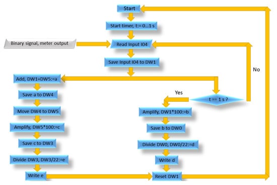 The algorithm for the operation of the PLC firmware, presented in Figure 3, was used to measure liquid flow. The algorithm consists of the following steps: