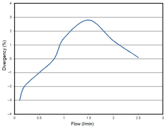 For the flow of 1 L of liquid, the meter sends 22,000 pulses. This can be easily converted into interesting values For example, as the declared range of flows is known to be 0.1 to 2.5 L/min, the minimum frequency of pulses is 36.6 Hz, while the maximum is 916.66 Hz. In terms of measurement uncertainty, the accuracy is at the level of ±3% of the measurement, and the deviation is shown in Figure 8. As for the dependence on external conditions, temperature issues have a very negligible influence on possible signal transmission issues, as the minimally increasing resistance does not interfere with the transmission of signals. The only limitation is the operating range of the meter, i.e. from −20 to 100 °C. However, in this range all deviations are within the declared ones.