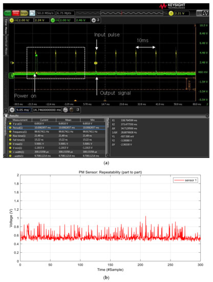Output signal of the PM sensor: (a) oscilloscope capture and (b) the measured output data by the MCU.