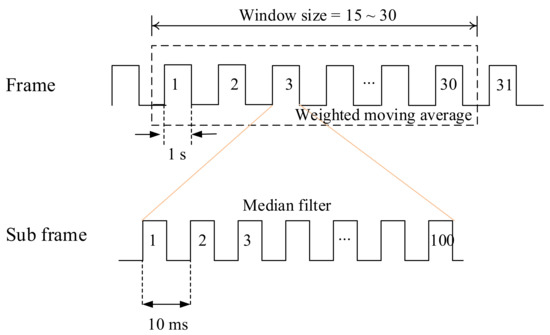 To minimize the short-term noise and calibrate the baseline from part-to-part variation, we proposed a system that calculates the concentration of the PM every second. As shown in Figure 5, each sub frame has 100 sensing phases for 1 s and then the system calculates the median over the 100 samples. As the second phase is to further reduce the noise, we applied a weighted moving average filter with a window size of 30 s (i.e., 30 data points) on the data. Current output voltage, , is determined by Equation (1). This approach further reduces the noise of the data.