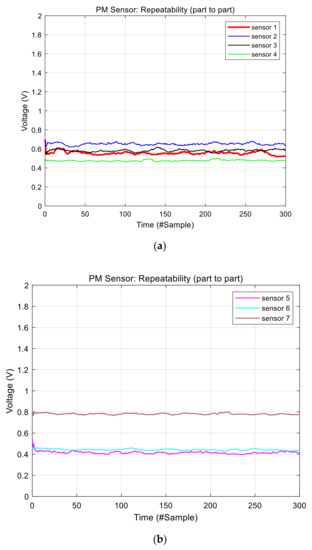 Performance evaluation: part-to-part repeatability: (a) data collected from sensor 1 to 4 and (b) data collected from sensor 5 to 7.