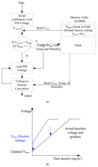 This study proposed an autonomous baseline search procedure in the initial phase, as shown in Figure 7, to reduce calibration cost for mass production. After booing sequence, the system has an initial calibration phase where the system reads voltage values from the PM sensor and then compares the median value, Vcurrent, with a factory setting voltage value, Vbase, stored in non-volatile flash memory. If Vcurrent is smaller than Vbase or it is equal to ‘−1′, it updates Vbase into flash memory. ‘−1′ means that it has never been calibrated and updated before. Figure 7b shows an example of Vbase update. After finishing the initial calibration phase, it reads and calculates the concentration of particles using the information about baseline voltage. The converter between the voltages to the concentration reads the baseline (called the intercept) voltage from the internal flash memory that was updated during the initial calibration phases.