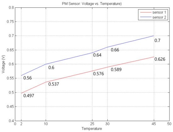 where, is the difference between ambient temperature and the initially stored temperature in the flash memory, and is offset voltage, 3.1 milli voltage, derived empirically from Figure 10. In the Figure, the difference between 2 °C and 45 °C is 129 milli voltage, which results in approximately 23 μg/m3. This difference should be compensated. For example, temperature difference between summer and winter seasons is more than 40 °C. In the worst case, assume that this sensor is used in a vehicle. The temperature inside the car increases up to more than 70 °C. Therefore, the temperature compensation is necessary for better accuracy. The voltage increment is caused by Dark current of the photodiode in the PM sensor [33,34]. This leakage doubles for each 8–10 °C temperature increase.