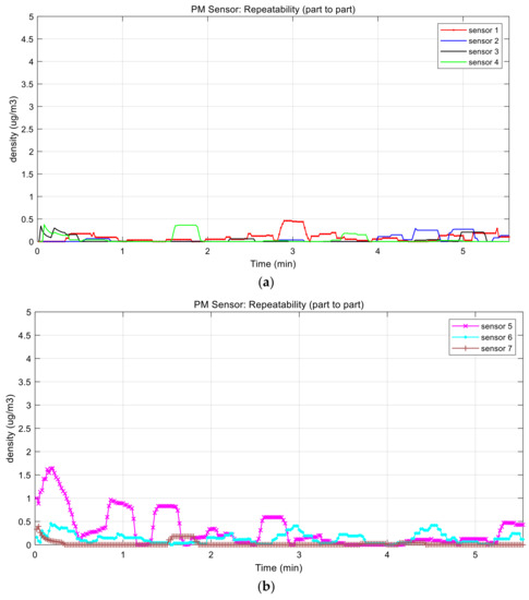 Figure 17b shows a graph showing the measurement results of the reference instrument AM510 and two laser sensors. As a result of the experiment, the error between AM510 and sensor 1 was about 4.4%, the error between AM510 and sensor 2 was about 6.1%, and the error between sensor 1 and sensor 2 was about 1.8%, indicating that variation between sensors was significantly reduced. Equation (5) was used to obtain the error. It turned out that the measured error was significantly lower than 20% of first approval of the particulate matter certification standard. In addition, the difference between the reference instrument and the sensors was significantly decreased under the concentration of 300 μg/m3. Actually, this laser-scattering-based PM sensor manufacturer also recommends the practical measurement range as 0~500 μg/m3 even if it can measure over 500 μg/m3. In fact, WHO recommends refraining from going out when there is more than 50 μg/m3 of particulate matters in the air and it is hard to exceed 200 μg/m3 in many countries except some from Asia. In Figure 17b, it seems that the error of the reference instrument is higher than that of the sensors equipped with the proposed methods. In the case of the reference instrument, it uses only information sensed every second and does not adopt the time-weighting filter such as a low pass filter. As a result, its output signal fluctuates. Although the number of devices is small, it was confirmed that there was a variation of 2% or less, which is five times less than the 10% of the variation between the sensor described in the manufacturer datasheet.