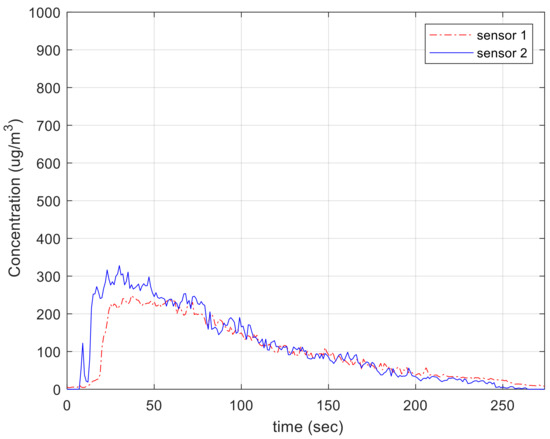 Then we conducted the performance evaluation of the two sensors (sensor 1 and sensor 2) including the proposed method with generated particles in the chambers. The evaluation was performed in room temperature (32 °C) with a relative humidity of 61%, and particle was produced by the candle as shown in Figure 13. It was too hard to generate the exact concentration of particles continuously and uniformly. Therefore, we just monitored the tendency of the two sensors as illustrated in Figure 15. Error between two sensors, as calculated by Equation (5), was approximately 10%. At the time of injecting dust particles, there was variation between the sensors because the dust was not evenly spread in the chamber. After particles were well distributed in the chamber, the error between the sensors decreased.