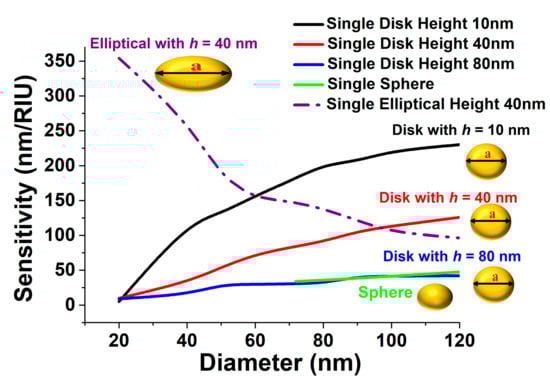- Chen, H.; Kou, X.; Yang, Z.; Ni, W.; Wang, J. Shape- and size- dependent refractive index sensitivity of gold nanoparticles. Langmuir 2008, 24, 5233–5237. [Google Scholar] [CrossRef]