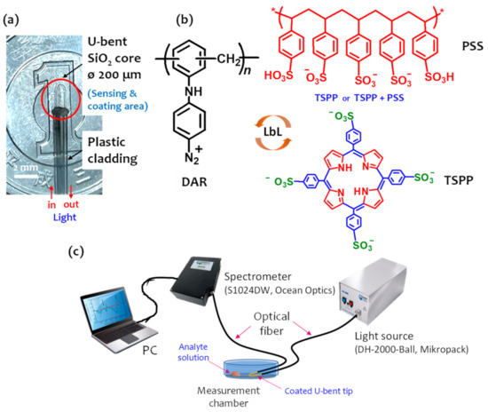 (a) Photograph of a U-bent optical fiber. (b) Chemical structures of DAR, TSPP, and PSS and a schematic of the LbL assembly of DAR and TSPP, or DAR and a TSPP+PSS binary mixture on a multimode U-bent optical fiber core followed by exposure to UV-radiation at 365 nm. (c) Schematic of the experimental setup for gas detection.