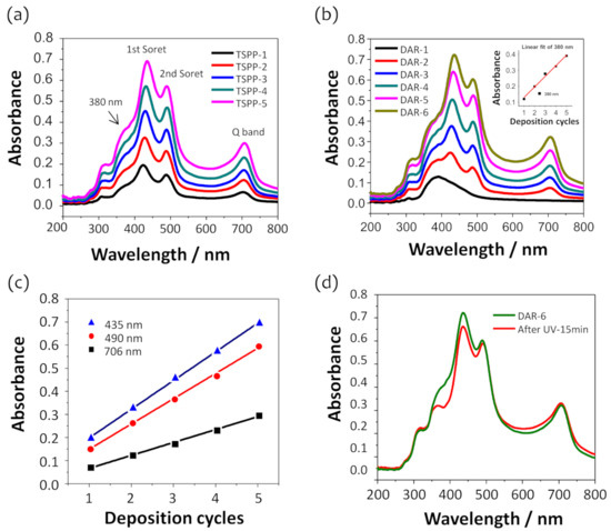 Evolution of the UV-vis absorption spectra of the DAR/TSPP+PSS (0.025 wt%) alternate layers deposited onto the 1-cm-long stripped core of a U-bent optical fiber when the outermost layer was deposited with (a) TSPP+PSS and (b) DAR, respectively. (c) Absorbance changes measured at (▲) 435, (●) 490, and (■) 706 nm. (d) Comparison of the UV-vis absorption spectra of the 5-cycle DAR/TSPP+PSS (0.025 wt%) film with an outermost layer of DAR before and after exposure to UV irradiation for 15 min.