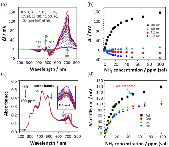 Figure 3a shows the intensity changes (defined as ∆I) in the transmission spectra due to the presence of ammonia in the 5-cycle DAR/TSPP+PSS (0.025 wt%) film, which is obtained by subtracting the transmission spectrum measured at a given ammonia concentration from that measured using water. As the ammonia concentration increased from 0 ppm to 100 ppm (sol), the intensity changes in the transmission spectra increased at 485 and 706 nm and decreased at 411 and 518 nm, respectively, as shown in Figure 3b. The most perceptible change in the intensity of the transmission spectra was observed at 706 nm. This result suggests the disappearance of the electrostatic interactions between the TSPP molecules due to the deprotonation process induced by the adsorption of ammonia molecules [22,31], indicating the distortion of the TSPP J-aggregates in the film.