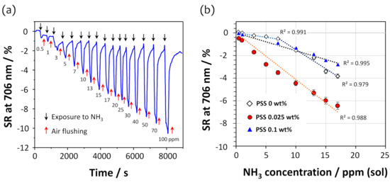 Figure 4b compares the SRs of the three DAR/TSPP+PSS sensor films, which were measured at 706 nm in all cases. Interestingly, the SR was influenced by the PSS content and increased in the following order: PSS 0.1 wt%, PSS 0 wt%, and PSS 0.025 wt%. In particular, the sensor film without PSS exhibited a slightly different adsorption behavior, having two linear ranges (0–7 ppm and 7–17 ppm), compared to the other two sensor films containing PSS, indicating a slow reaction at low ammonia concentrations. It may be that the diffusion of ammonia into the film is disturbed at low concentrations.