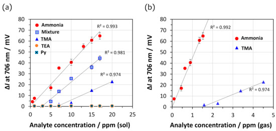Calibration curves for the intensity change (ΔI as sensor response, n = 3) at 706 nm of the 5-cycle DAR/TSPP+PSS (0.025 wt%) film sensor (a) at different solution concentrations of ammonia, TMA, TEA, Py, and a mixture of all four analytes (equal concentrations in the range of 0–17 ppm for each), and (b) at different gas concentrations of ammonia and TMA.