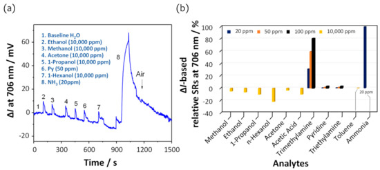 (a) Dynamic response to ammonia and other chemical analytes. (b) Comparison of the intensity change-based relative SRs at 706 nm on exposure to ammonia (20 ppm), TMA, TEA, Py (20 ppm, 50 ppm, 100 ppm, respectively), and all other analytes at 10,000 ppm.