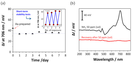 To confirm the long-term stability of the SR, the DAR/TSPP+PSS (0.025 wt%) film was repeatedly exposed to 7 ppm (sol) ammonia over seven days. As shown in Figure 7a, the ammonia SR was almost stable over seven days, showing an average intensity change of 34.8 ± 1.5 mV, which is approximately 77% of the first measurement result of the as-prepared film, where the standard deviation of ±1.5 mV represents a variation of approximately 0.4 ppm in ammonia concentration from the sensitivity value (4.05 mV ppm−1) in Table 2. As mentioned above, this small decrease in intensity at 706 nm may be due to the optimal placement of non-crosslinked TSPP molecules inside the film. In addition, similar results were obtained in a series of repeated ammonia exposure experiments over a short period of time (inset in Figure 7a).