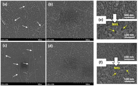 SEM images of (a,b) 5-cycle DAR/TSPP and (c and d) 5-cycle DAR/TSPP+PSS (0.025 wt%) films deposited on silicon wafer substrates (a and c) before exposure and (b,d) after exposure to 10,000 ppm (sol) ammonia gas for 2 min. The arrows in white in (a,c) point to TSPP J-aggregates. Magnified SEM images showing dozens of holes (see arrows in yellow in both cases) after ammonia gas exposure in the sensor films (e) without PSS and (f) with PSS (0.025 wt%).