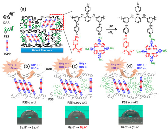 (a) Photochemical crosslinking reaction between DAR and the mixture of TSPP and PSS within the multilayered thin film. Schematic illustration of the DAR/TSPP+PSS films with (b) PSS 0 wt%, (c) PSS 0.025 wt%, and (d) PSS 0.1 wt% and photographs of contact angles of the corresponding films. The arrows indicate changes in the contact angle from DI water to a 70-ppm ammonia solution.