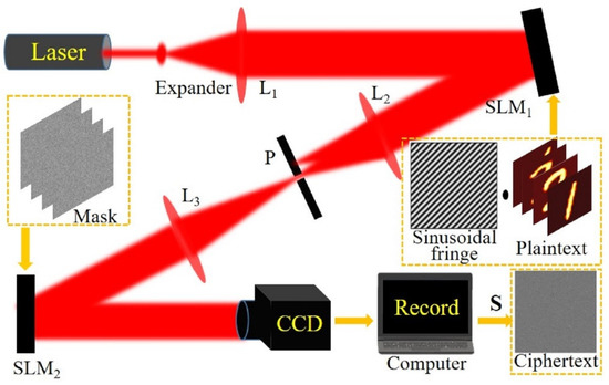 In 1995, Refregier et al. [3] proposed an optical image encryption scheme based on double random phase encoding for the first time, which means it uses two uncorrelated random phase templates and Fourier transform to realize optical image encryption. In essence, this scheme is based on optical transformation to disturb the information of plaintext images and generate ciphertext images, such as fractional Fourier transform [4], fractional wavelet transform [5], fractional Merlin transform [6], interference [7], single-pixel imaging [8,9], etc. Optical image encryption belongs to parallel encryption with high speed and high efficiency, but its encryption performance is limited by the technology and precision of various optical devices in the optical path [10].