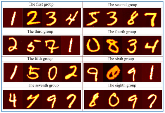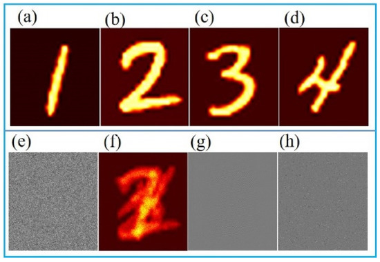 In order to prove the feasibility of our method in encryption and the superiority of decryption, we conduct numerical simulation experiments to verify it. In the process of encryption, 32 images are selected from MNIST handwritten digital dataset and divided into eight groups, with four images in each group, and the resolution is 256 × 256. Figure 4 shows the encryption process for multiple images.