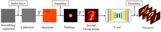 - Fourier transform is applied to the superimposed ciphertext image and appropriate down-sampling is carried out according to the specific spectrum distribution of each group;