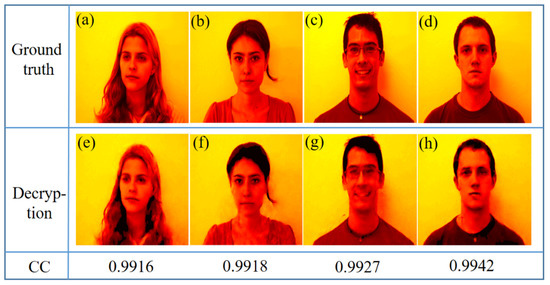 where denotes the expected value operator, and σ is the standard deviation of the corresponding image. It and I are the original plaintext images and decrypted images, respectively. The closer CC value is to 1.0, the better the quality of the reconstructed images. The decryption results are shown in Figure 6, with CC of 0.9939, 0.9903, 0.9951, and 0.9966, respectively.