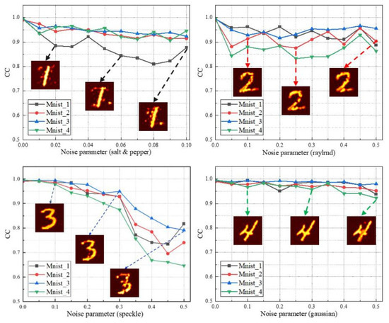 It is also necessary to evaluate the robustness of the encryption algorithm when the ciphertext is attacked by noise. In order to verify that the encryption method has good anti-noise ability, speckle noise and Gaussian noise are added in the process of network training to improve the robustness. The mean values of speckle noise and Gaussian noise added in the training process are all 0, and the variance is randomly selected in (0.05, 0.06, 0.07, 0.08, 0.1). At the same time, four different types of noise attacks are added into the ciphertext: Gaussian noise, speckle noise, raylrnd noise and salt and pepper noise. CC change curve of decrypted image under noise attack is shown in Figure 11.
