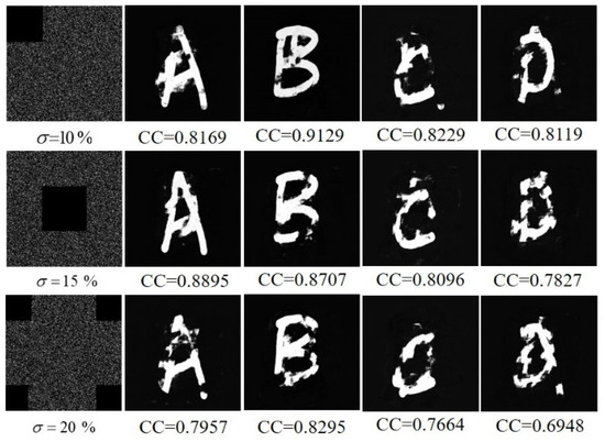 For Gaussian noise and speckle noise, the abscissa represents the variance parameter. It can be seen from Figure 11 that the proposed encryption model has a very good ability to resist Gaussian noise. Even when the variance is 0.5, CC is still higher than 0.9. At the same time, when the network is attacked by other kinds of noise, although the decryption quality decreases with the increase of noise, the image can still be decrypted clearly.