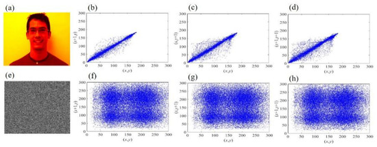 (a) One of the plaintext images. Correlation distributions of the plaintext image in horizontal (b), vertical (c) and diagonal (d), respectively. (e) Ciphertext image. Correlation distributions of the ciphertext image in horizontal (f), vertical (g) and diagonal (h), respectively.